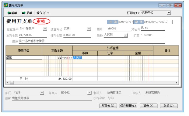 6. 反审核单据时,如系统自动生成的凭证已签字或已审核,单据不能反审核,提示“相应凭证已审核或已签字,不能反审核”;