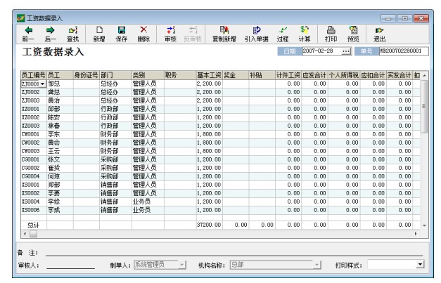 工资数据录入的主要功能是为了录入按照月度工资核算的员工工资的资料,它包含了员工个人工资各项具体项目、应扣工资和实发工资的情况,在编制完数据之后需要对本月工资重新进行计算,然后就可以打印各种工资条或工资表了