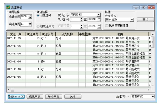 点击窗口下方的[成批审核],系统将询问是否成批审核列表中的凭证,点击[是],则所有未审核的凭证都将被审核;点击[否],则不审核任何一张凭证。