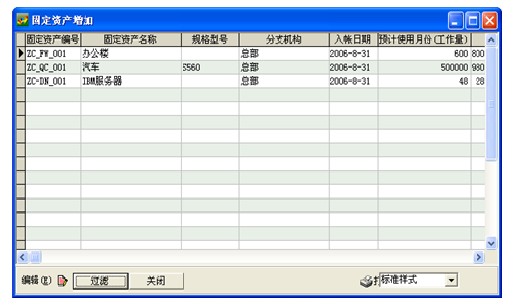 1. 点击[编辑]→[增加],打开“固定资产”编辑窗口;